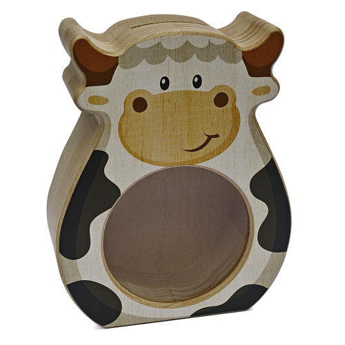 Mealheiro em madeira cem forma de Vaca. Com vidro acrílico para se ver o inteerior. Mecanismo deslizante de abertura.