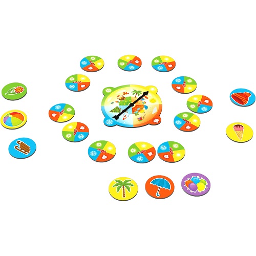 As estações estão completamente misturadas! Todos os jogadores ajudam a colocar as fichas da temporada na ordem certa novamente. O jogador que tiver boa memória e tiver sorte ao girar o disco será o primeiro a colocar quatro peças diferentes à sua frente e ganhar. Um divertido jogo de memória e sorte. De 2 a 4 Jogadores. Regras em português no interior