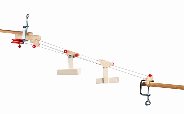 2 Teleféricos em madeira para montar com mecanismo de vai-vem. Contém parafusos e cola, necessita de chave de parafusos para montar. Instruções em Português.