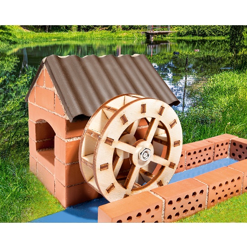O moinho de água é uma combinação de pedra e madeira. O moinho em si é de tijolos e a nora é feita de madeira. A nora é montada rotativamente.