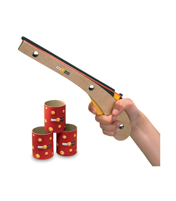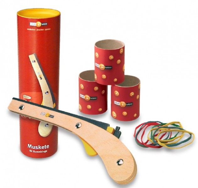 Quem tem a mão mais estável? O alvo está defenido? Quem consegue acertar na lata? Fogo! Mosquete de brincar para elásticos. Os elásticos são uma munição segura e disponíveis em várias lojas. Com instruções em português.