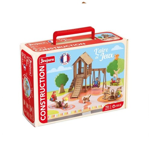 Parque Infantil em madeira com 70 peças: conjunto de construção em madeira natural e tingida com instruções de montagem, um tapete de brincar e vários acessórios.