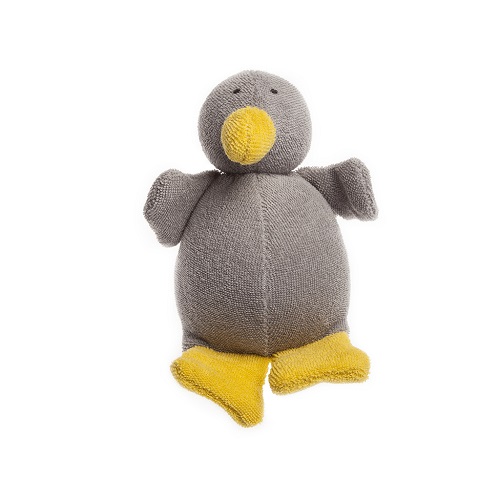 Patinho algodão orgânico (kbA), preenchido com 100% lã de ovelha Biológica (kbT). Com guizo no interior, tornando-o numa divertida roquinha.