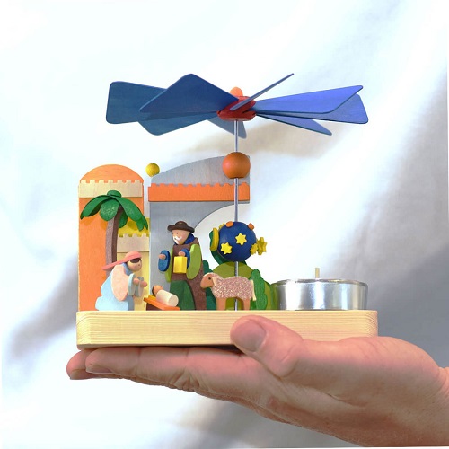 O nascimento de Cristo é provavelmente o motivo mais popular nas pirâmides de Natal nas Erzgebirge. Todas as figuras e animais são pintados à mão. A pequena pirâmide de teelight com seus inúmeros detalhes é um presente popular - seja para um amigo querido, os filhos (netos) ou como um presente original na época do Natal. Claro que também pode usá-lo para ficar feliz e evocar uma ótima decoração de Natal.