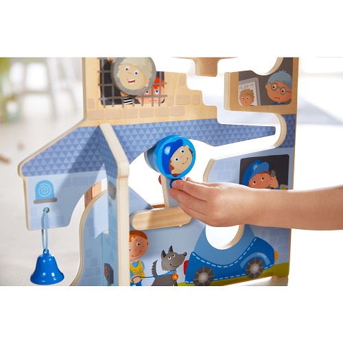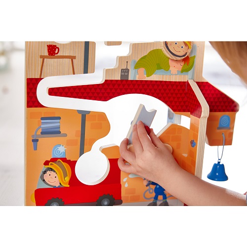 Temos uma situação de emergência! Quer seja de um lado ou de outro, os bravos Bombeiros ou os destemidos Polícias são chamados à acção! O helicóptero no topo carrega um dos rolos temáticos da pista, pronto para começar. Depois é ver as peças rolar pelo cenário abaixo. Com uma pequena alavanca, as crianças terão que decidir para que lado vão as rodas! Ou para a rua tocar o sino, ou para dentro do camião ou do carro. Uma pista de motricidade para fomentar a destreza e a atenção, com frente e verso e duas rodas.