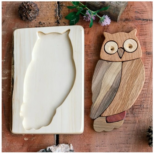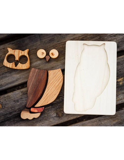 A coruja é uma ave majestosa, símbolo de sabedoria e misticismo, por isso quisemos prestar-lhe esta pequena homenagem em forma de puzzle. Na realidade é muito mais que um quebra-cabeça. O nosso mosaico em forma de coruja não deixará indiferentes crianças e adultos. Cada peça provém de diferentes tipos de madeira (carvalho, zimbro, faia, etc...), serradas e lixadas à mão, transformando-a num material bonito e único.