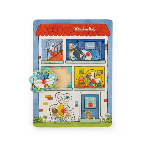 Um puzzle sonoro para despertar o interesse das crianças pela música de forma lúdica. Encaixe as 6 peças de madeira que compõem a casa de Puce e Pilou e descubra sons do dia a dia: campainha, telefone... Também ajuda as crianças a aprenderem sobre formas e cores.