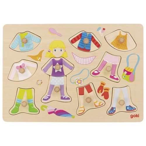 O brinquedo certo para pequenos estilistas! Para vestir, despir e trocar de roupa o tempo todo. Isso é divertido para todas as crianças. Puzzle de encaixe em madeira com 7 peças.