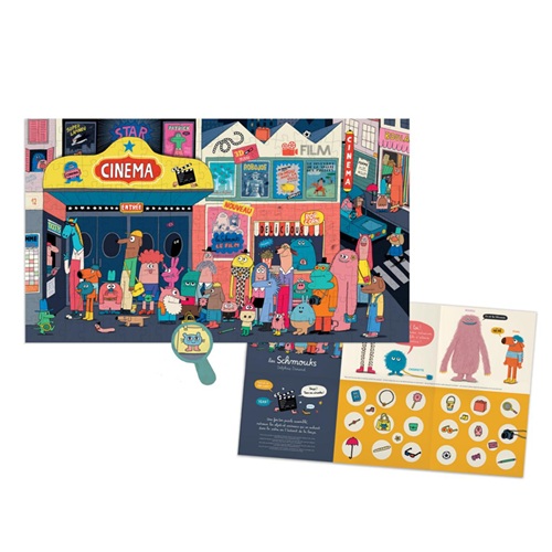 Puzzle de observação de 200 peças. No cinema + 1 poster. Coleção Schmouks. Depois de montado, usa uma lupa para encontrar os objetos e animais escondidos na ilustração de Delphine Durand. A partir de 6 anos.