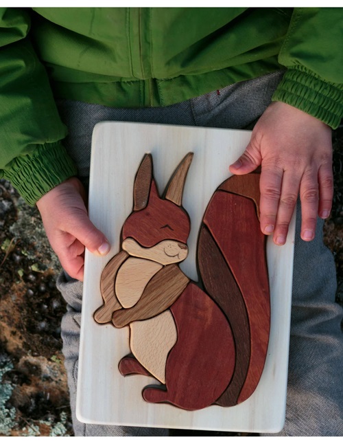 Na realidade é muito mais que um puzzle. O nosso mosaico em forma de esquilo não deixará indiferentes crianças e adultos. Cada peça provém de diferentes tipos de madeira (carvalho, zimbro, faia, etc...), serradas e lixadas à mão, transformando-a num material bonito e único.