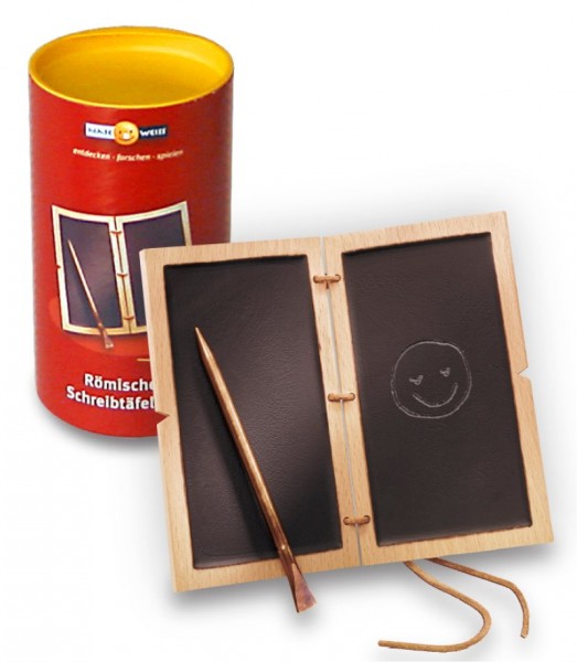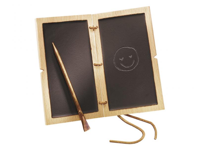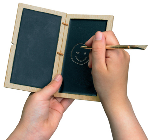 O conhecimento tem vindo a crescer ao longo das civilizações, os Romanos começaram a usar este tipo de quadros há mais de 2000 anos para tomar notas, escrever cartas ou fazer cálculos. Este pequeno quadro é feito com dois quadros em madeira cobertos com cera. Com um estilete em bronze para desenhares e apagares. Com instruções em Português.