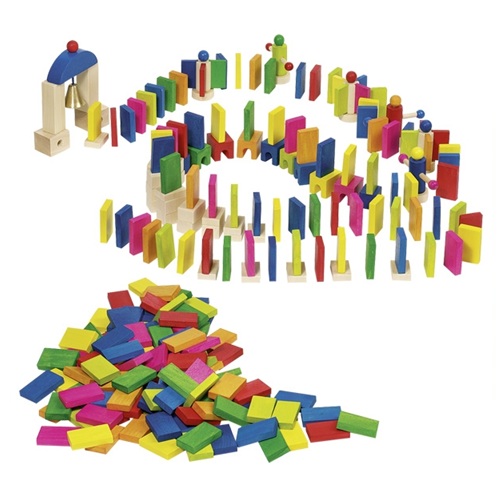 Agora o quarto das crianças pode ganhar vida! Com este exclusivo jogo de dominó feito de blocos de madeira coloridos e uma plataforma giratória funcional, poderás construir todos os tipos de variações interessantes. Um sino toca quando os blocos chegam ao seu destino. Contém 247 peças