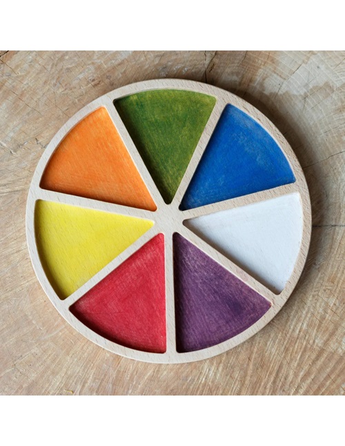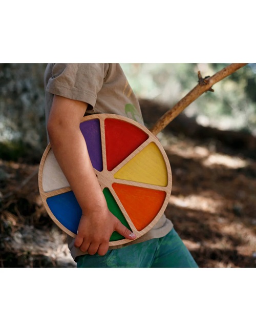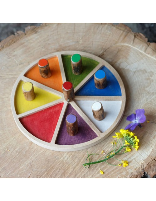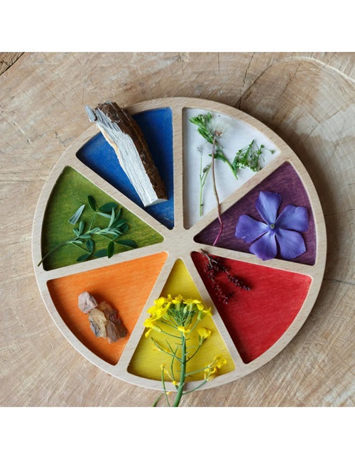 Roda de Cores é uma bandeja sensorial feita de madeira de faia natural. Cada seção é pintada em uma cor, ideal para começar a classificar objetos ou elementos naturais por cor.