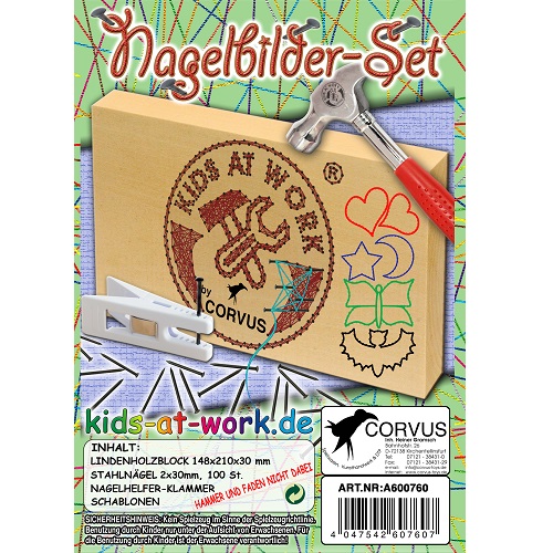 Conteúdo - 1 Bloco de madeira 148x210x30mm, 100 Pregos, 1 mola para segurar o prego enquanto se martela e modelos