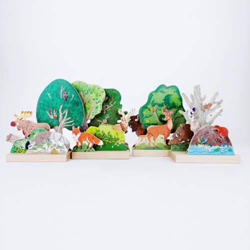 Poderás ver um monte de gravetos e um castor nele. Um esquilo sobe a uma árvore e os pássaros cantam as suas canções acima dele. E quem está se escondendo atrás de uma árvore? É um poderoso bisonte, olhando em nossa direção. Ao lado dele, um alce calmamente emerge do arbusto. Até a família Urso deixou seu esconderijo. Há também um lince, mas é uma criatura tímida e não tão fácil de detectar. Todas as plantas e animais co-criam a floresta. Mas esta floresta é especial, pois também é um teatro e seus habitantes são atores. Os papéis que eles desempenham contam a história da vida na floresta.