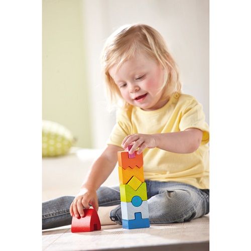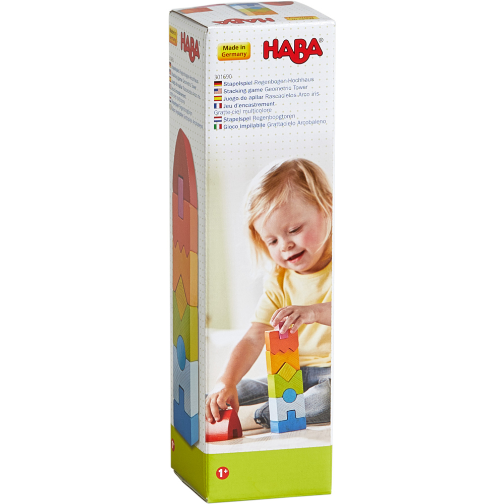 Esta Torre geométrica é fiel ao seu nome, tem as cores do arco-íris. Quanto todas as 9 formas de madeira são empilhadas adequadamente, a Torre exibe toda a sua glória. Enquanto o seu filho ergue apaixonadamente esta torre, as suas habilidades motoras e a sua percepção das formas geométricas estão a ser trabalhadas. Quando a torre estiver em pé, é emocionante derrubá-la e começar de novo!