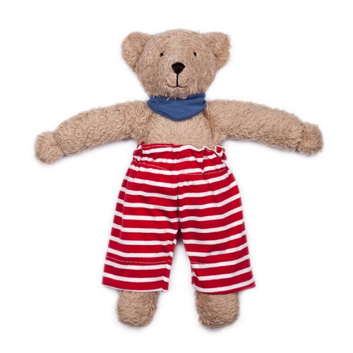 Ursinho de peluche 100% Orgânico (algodão e lã) vestido com calças e lenço ao pescoço que dão para vestir e despir. Presente ideal para uma criança que quer ter um companheiro para todas as suas brincadeiras e também para o acompanhar a dormir.