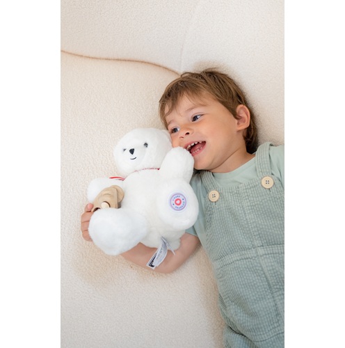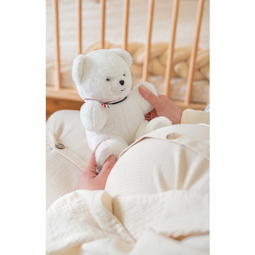 Ofereça um momento de ternura e cumplicidade com este ursinho de peluche branco. O seu exclusivo sistema de articulação Fleximoov® permite que ele "ganhe vida" e a sua maciez fazem dele um presente original e personalizado para uma futura mamã ou para um bebé. Este brinquedo de peluche feito na França é fabricado na oficina da marca em La Guerche-de-Bretagne. Um presente ideal para bebés!