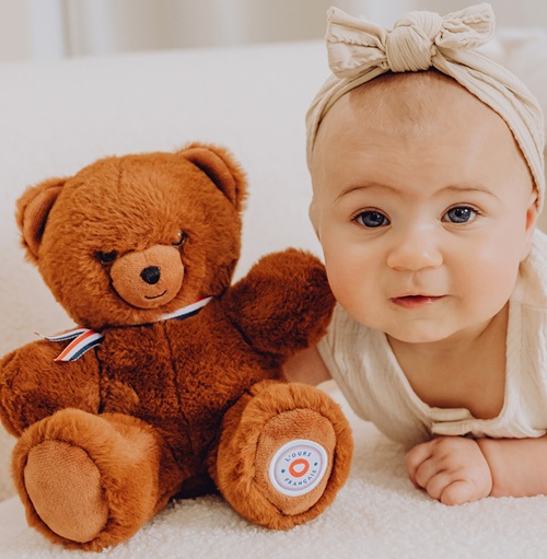 Ofereça um momento de ternura e cumplicidade com este ursinho de peluche Castanho. O seu exclusivo sistema de articulação Fleximoov® permite que ele "ganhe vida" e a sua maciez fazem dele um presente original e personalizado para uma futura mamã ou para um bebé. Este brinquedo de peluche feito na França é fabricado na oficina da marca em La Guerche-de-Bretagne. Um presente ideal para bebés!